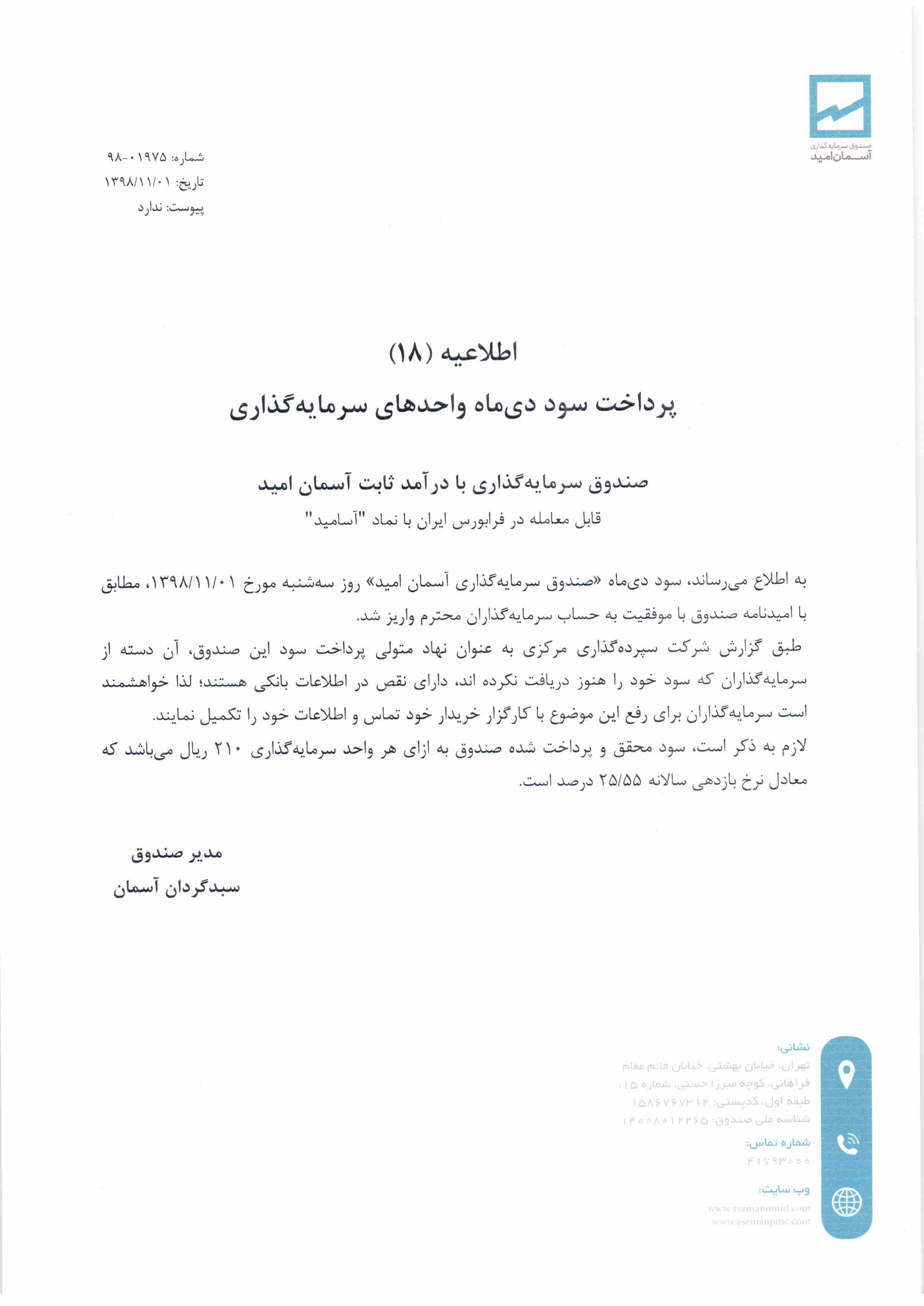 سود دی ماه صندوق آسمان امید پرداخت شد؛ ۲۵.۵۵%